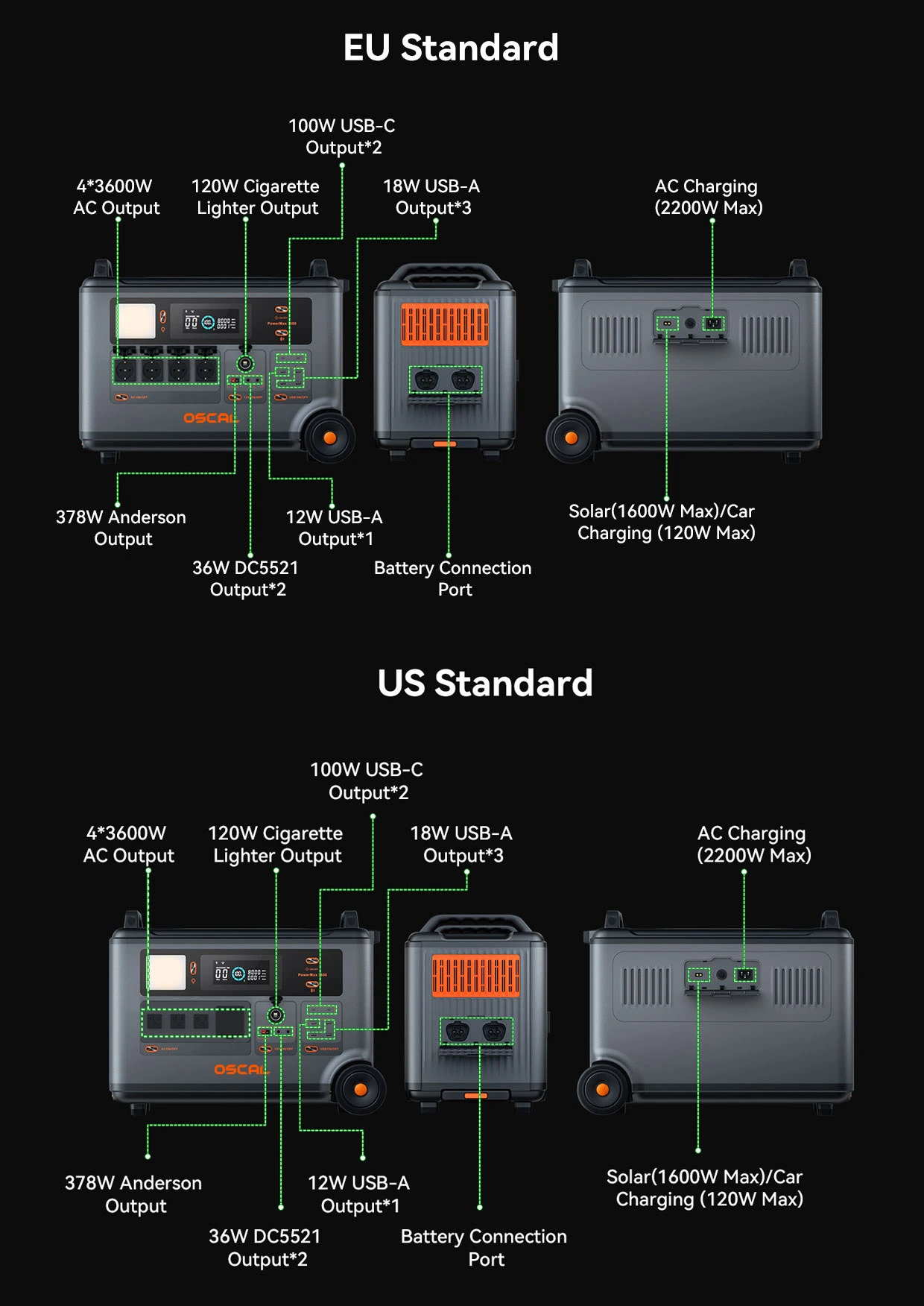 1xOscal PowerMax 3600 1x User Manua+Warranty Card 1*AC Charging Cable 1*Car Charging Cable 1*Solar Charging Cable |