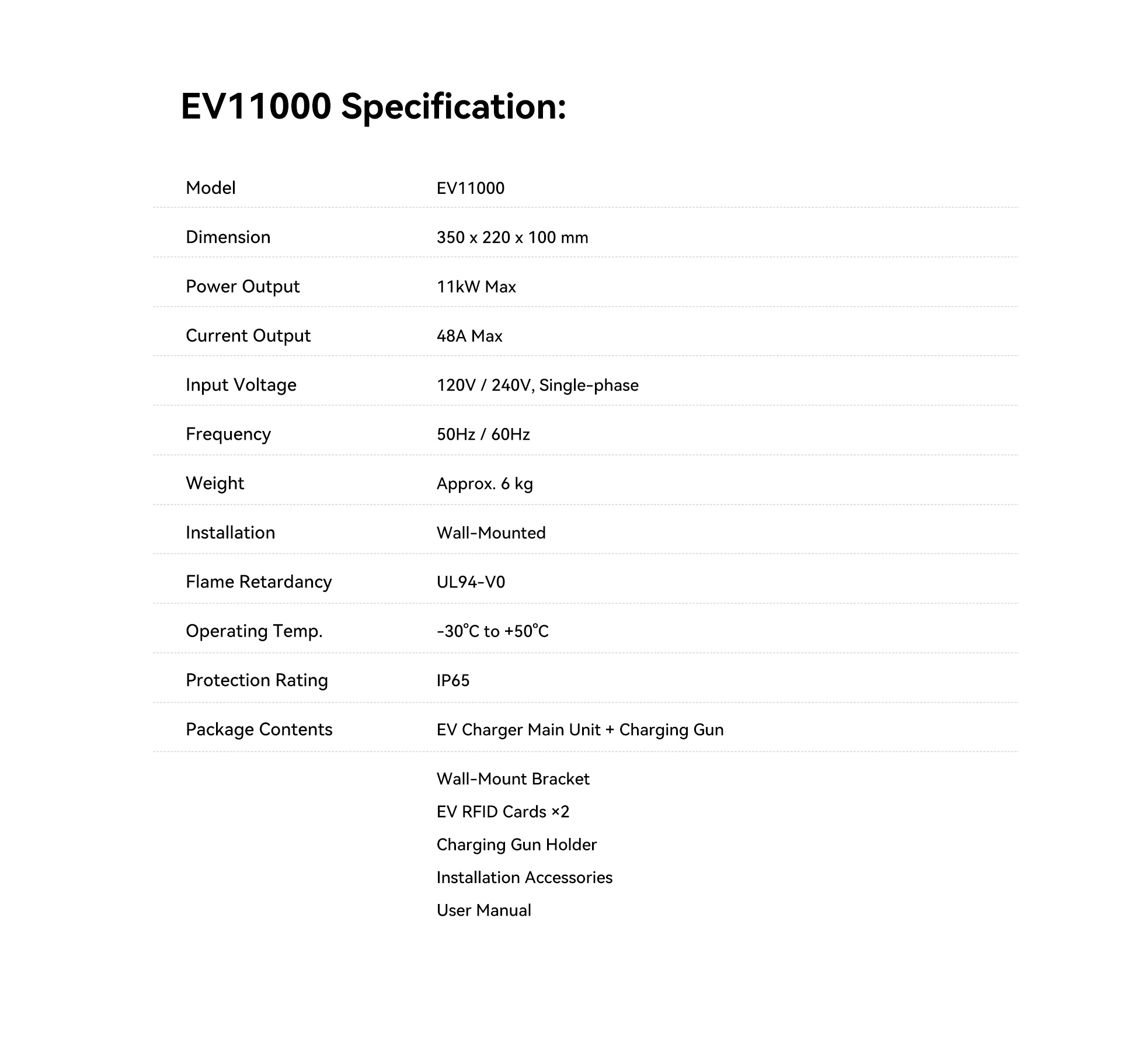 | Package Contents | EV Charger Main Unit + Charging Gun Wall-Mount Bracket EV RFID Cards ×2 Charging Gun Holder Installation Accessories User Manual |