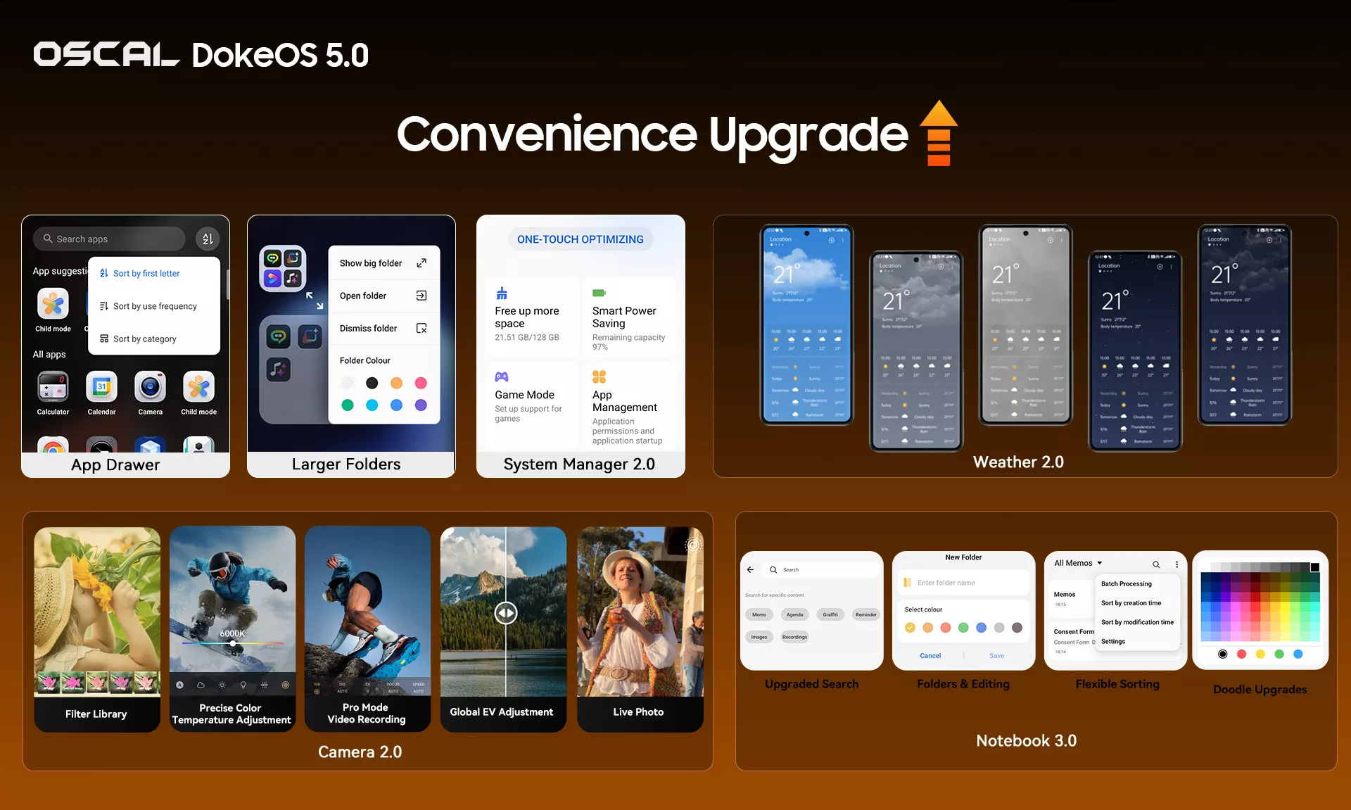 Centered on users' daily high-frequency needs, DokeOS 5.0 refines operational convenience to enhance efficiency. The updated desktop integrates an App Drawer with intelligent sorting by initial letter, usage frequency and category, along with a one-click search center that halves the time spent finding apps. Large Folders strike a perfect balance between desktop neatness and practicality through intuitive icon displays. System Manager 2.0 provides three-level cleaning for junk files and cache, identifies rarely used apps, and allows uninstallation of pre-installed applications. Camera 2.0 features one-click access to a full suite of pro shooting tools including filters, grid lines, watermarks, level, color temperature and EV adjustment. It also supports Live Photo and Pro Mode for video recording, empowering users to capture high-quality, crisp visuals effortlessly in any shooting scenario. Notebook 3.0 supports efficient note-taking with unified search, batch management, rich text editing and repeat reminders, while Weather 2.0 delivers scenario-based dynamic effects and intelligent suggestions for dressing and travel.