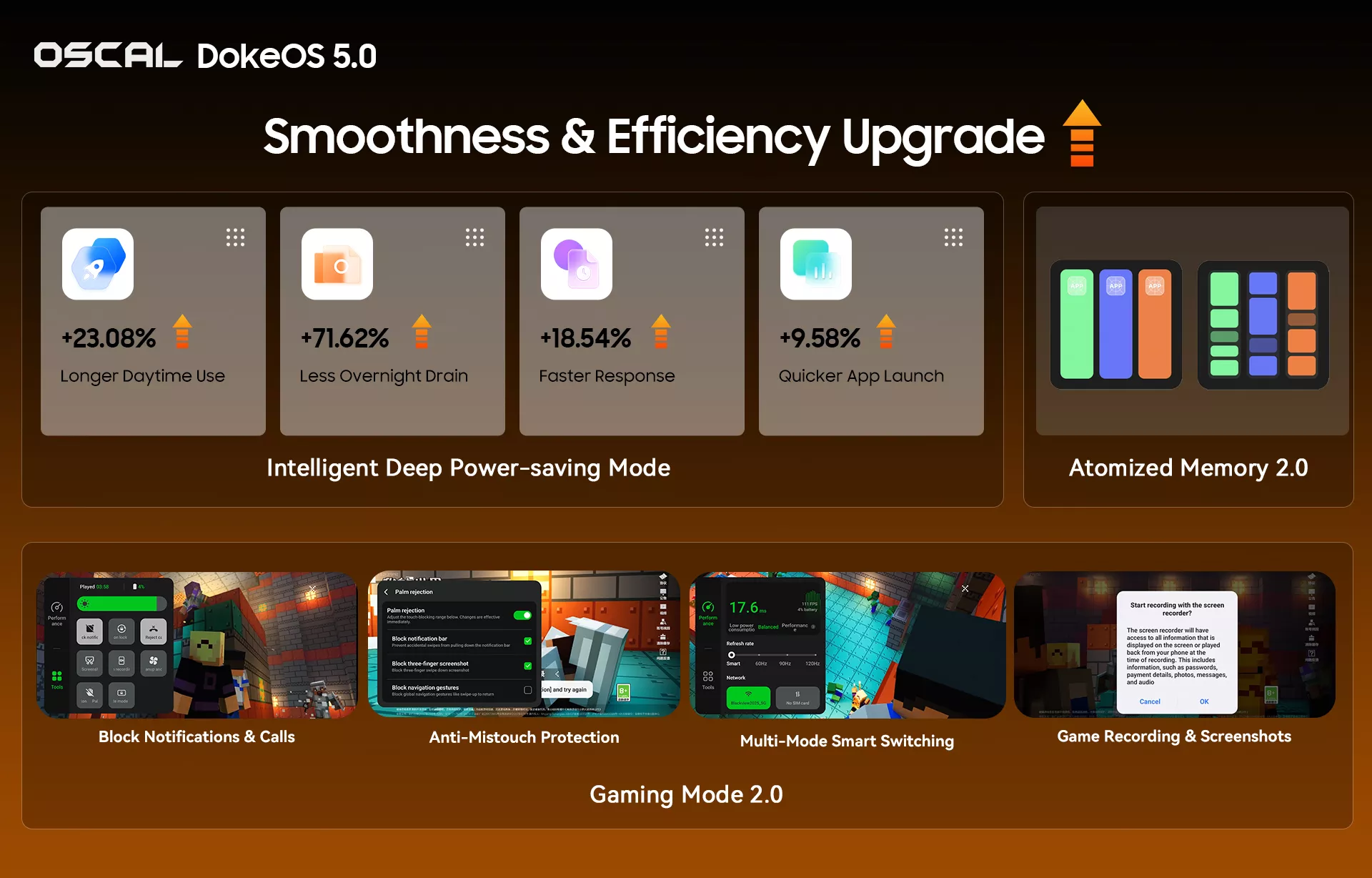 Focused on achieving a quicker, steadier and more power-saving experience, DokeOS 5.0 realizes three key improvements through in-depth underlying technology adjustments and intelligent resource management. Its exclusive Deep Power-saving Mode achieved 23.08% daytime power reduction and 71.62% night standby power savings in internal tests compared to the previous system version. These technological upgrades directly translate to a quicker and steadier user experience: DokeOS 5.0’s response speed has been increased by 18.54%, and app launch speed has improved by 9.58%. Atomized Memory 2.0 can increase available RAM by up to 9%, ensuring priority operation of core tasks. For gaming scenarios, Gaming Mode 2.0 allows one-click switching between Low Power, Balanced and Performance modes, blocks annoying notifications, prevents accidental touches, and provides one-click screen recording and screenshot functions to elevate the gaming experience.