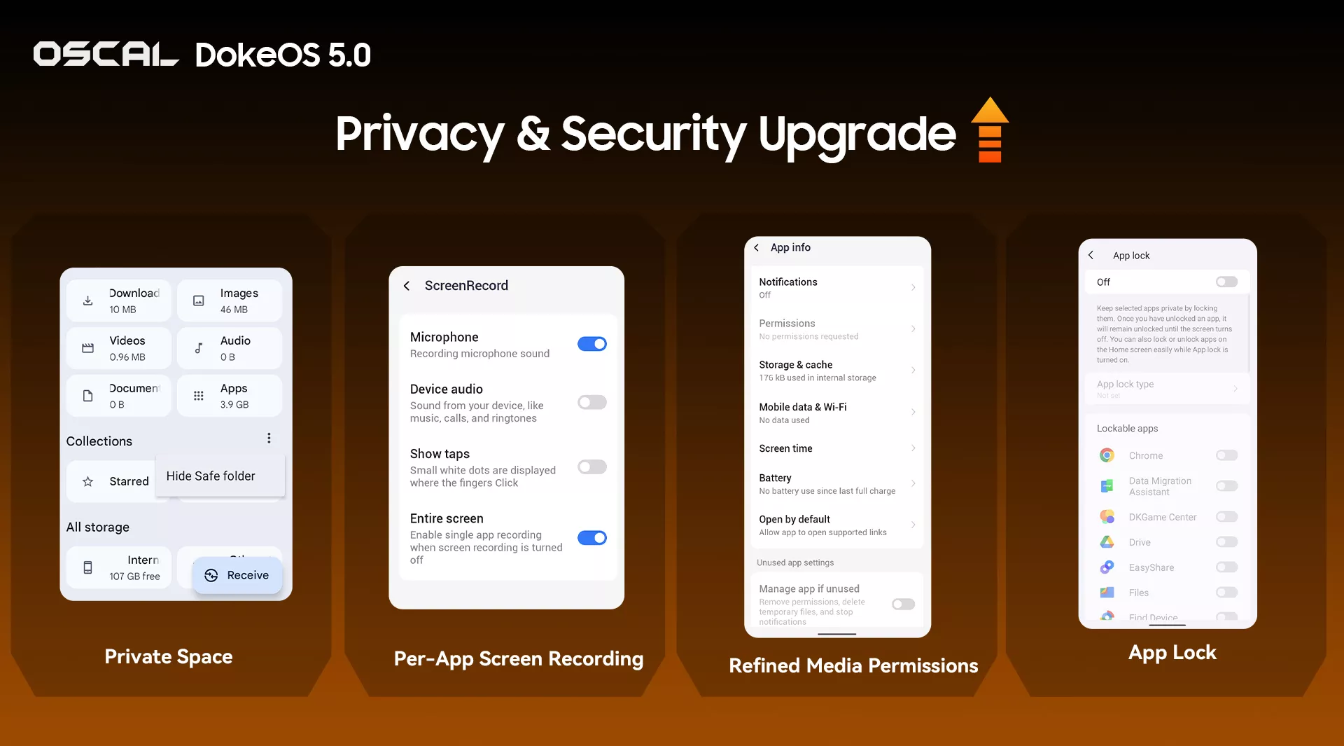 DokeOS 5.0 is equipped with a full-featured security system to provide reliable privacy protection for users. Private Space allows users to store sensitive content under the protection of a separate password. Refined Media Permissions enable users to manage apps' access to photos and videos, preventing unauthorized data collection. The Per-App Screen Recording function avoids leakage of sensitive information during screen recording, and App Lock offers comprehensive protection for high-privacy social and financial apps, further strengthening users' information security.