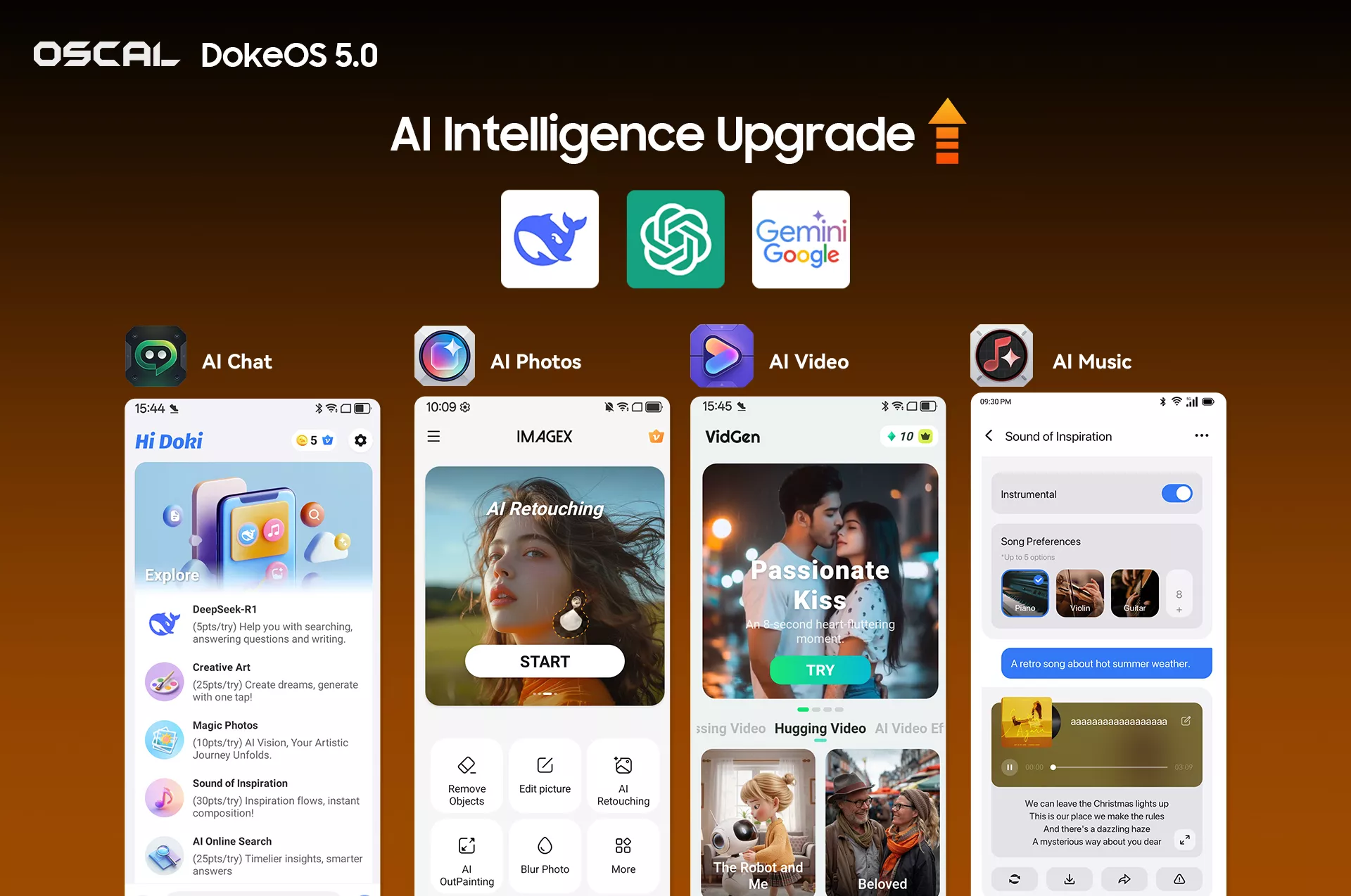 DokeOS 5.0 comes pre-installed with OSCAL’s proprietary Doke AI 2.0, which is deeply integrated with the top three global AI models — DeepSeek R1, ChatGPT-4o Mini, and Gemini 2.0 Flash — to support all-scenario intelligent creation and efficient information processing. Complemented by four creative AI apps—all providing a 30-day free trial to reduce the creation threshold — DokeOS 5.0 simplifies intelligent creation for every user. AI Chat supports intelligent dialogue, document parsing and information retrieval, helping users handle daily tasks efficiently. AI Photos offers 18 professional tools, enabling one-click AI retouching and object removal. AI Video supports text-to-video and image-to-video creation, while AI Music generates custom original music based on keywords and styles, making creative production accessible to everyone.