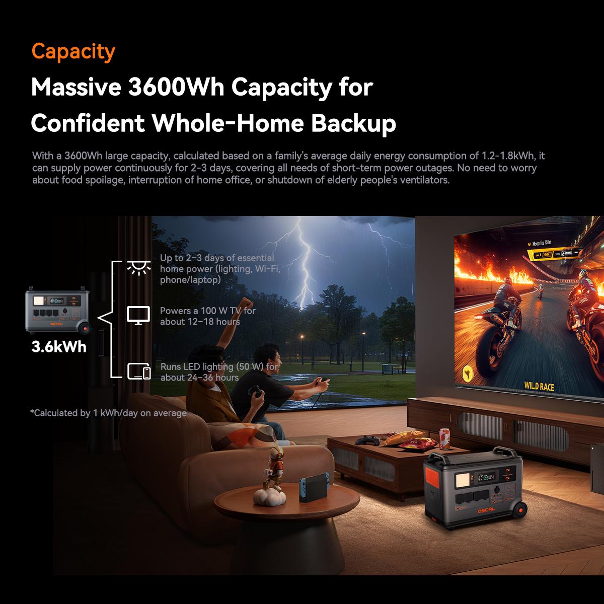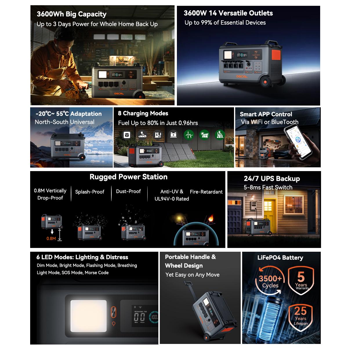 - 3600Wh Large Capacity — Powers whole home for 2–3 days, long-lasting energy for outdoor camping;
