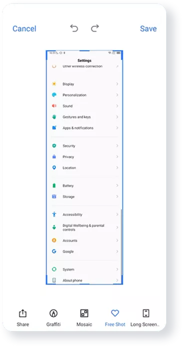 See something interesting on the smartphone and want to take a screenshot of it? Doke OS 2.1 makes things much simpler. You can either press the power button and volume- button simultaneously or use three fingers to swipe down on the screen to take a screenshot. More surprisingly, you can choose standard screenshot or long screenshot as you please.