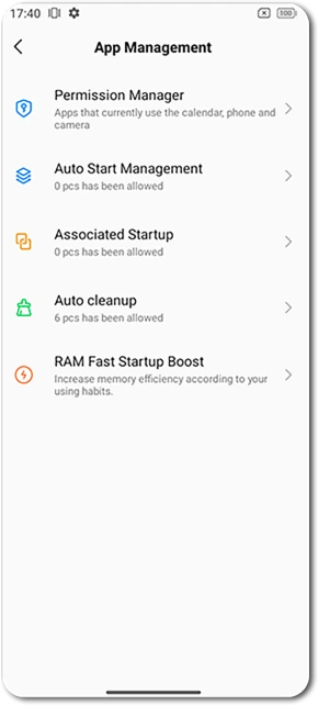 Gain full control over apps: view permissions, auto-start, and auto-clean settings to decide their usage.