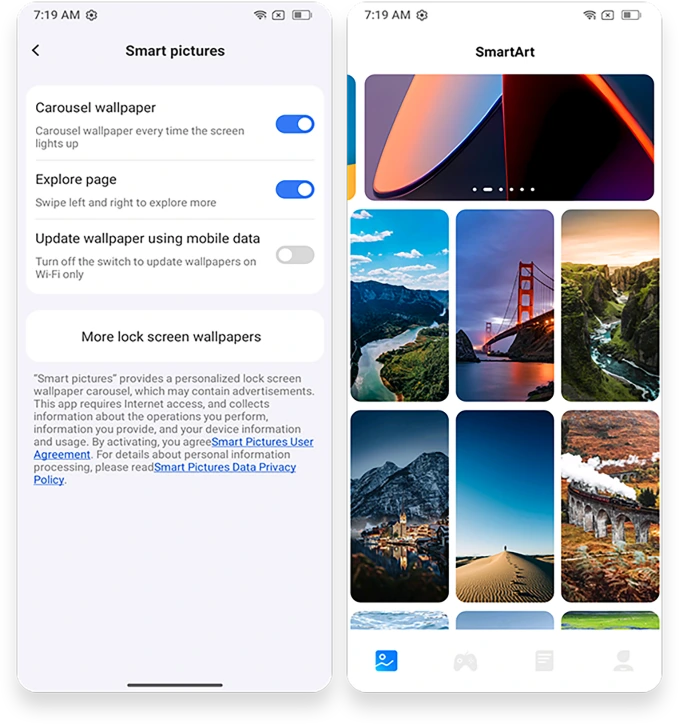 Select your favorite wallpapers for a personalized lock screen carousel, discover exciting game recommendations, and stay informed with curated news in entertainment, sports, and more. SmartArt turns your lock screen into a hub of creativity, fun, and information tailored just for you!