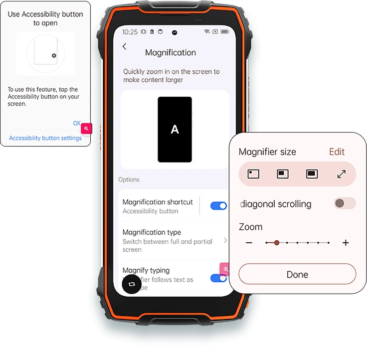 The enhanced magnifier supports pinch-to-zoom functionality, making it easy to read small text or examine intricate details with precision and convenience.