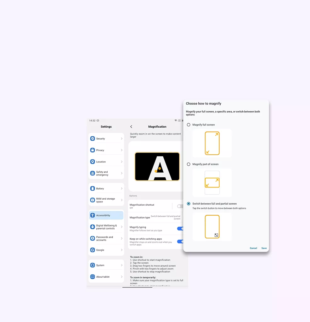 Upgraded MagnificationEffortless Pinch-to-zoomPinch to zoom in and out on Pad 5 upgraded magnification for a more intuitive and convenient way to view small text and detailed visuals.
