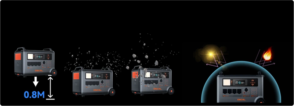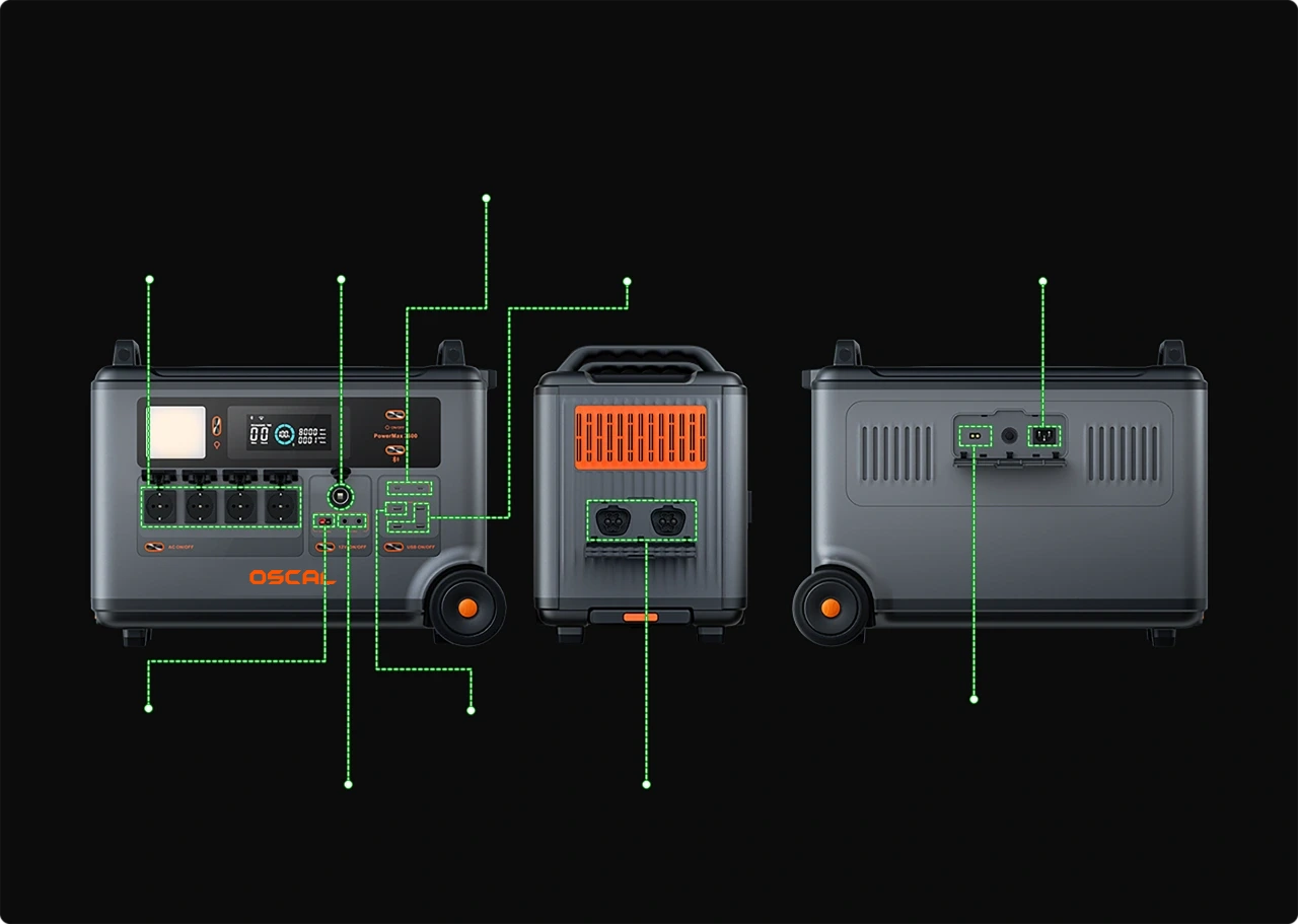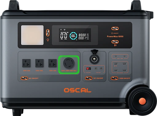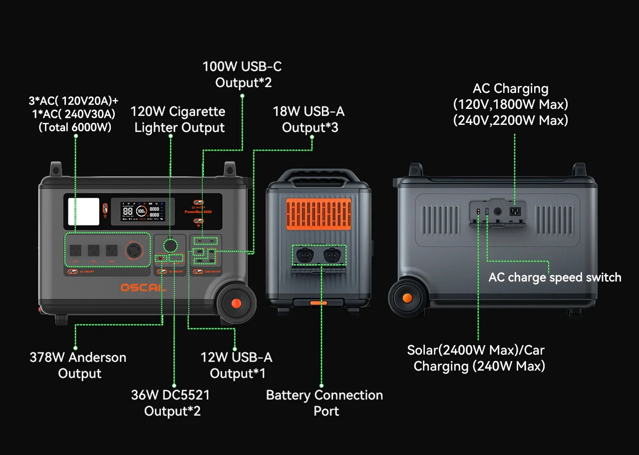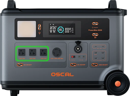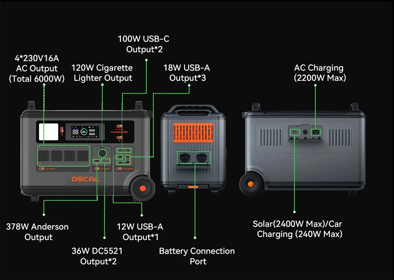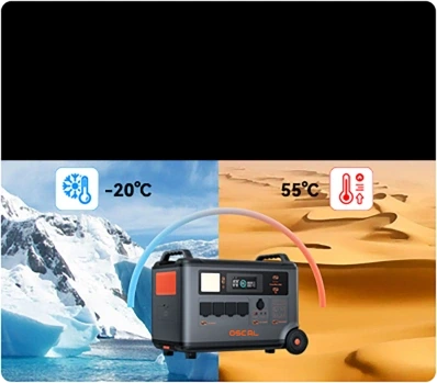 | Note: | OSCAL PowerMax 6000 uses Buck Constant Power Tech to ensure stable output power and reliable operation of the device. 1. Temperature < 55°C: The device operates at 6000W for 5 minutes then reduces to 5000W output with constant power. 2. Temperature ≥ 55°C: The device immediately reduces output to 5000W with constant power. For extended high-power usage, PowerMax 6000 is recommended to use with battery pack BP3600 for longer usage time. | |